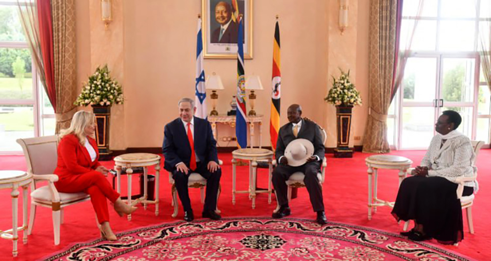 On a one-day visit to Uganda, Prime Minister Benjamin Netanyahu and his wife Sara were welcomed by President Yoweri Museveni and his wife, Education Minister Janet Museveni, at the Entebbe Presidential Residence.
