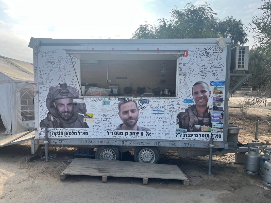 Inching his pickup truck up to an IDF post where troops were securing the border in the Eshkol region, he stopped to hand out falafel and shakshuka sandwiches to the soldiers. Gesturing toward an IDF tank being towed on a flatbed truck, he asked this reporter, “Do you see that tank crossing into Gaza? How can anyone say the war is over, as long as our soldiers are in Gaza and not at home?”
