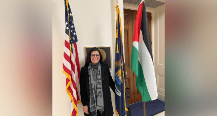 Tlaib tweeted a picture of herself standing next to a Palestinian flag that she had placed in her office on Capitol Hill in Washington, D.C.