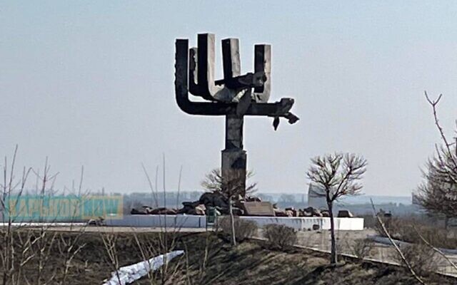 According to Ukrainian government officials, a large monument at the Drobytsky Yar memorial, near Kharkiv, was damaged by Russian shelling.