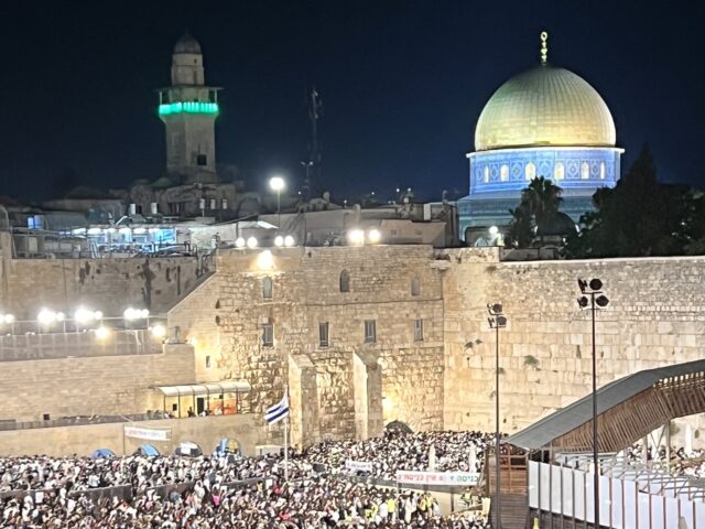 A dove observes Selichot prayers while perched on the Western Wall, the holiest site in Judaism, in Jerusalem, Israel. Sep. 10, 2023 (Joel Pollak / Breitbart News)