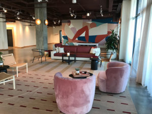 “Upon entering the living room-style lobby, eyes will immediately be drawn to a bespoke, gallery-worthy concrete reception desk,” is how Hospitality Design described it. “Framed vistas juxtaposed with natural, warm raw materials; color-blocked, dusty, sunset-toned fabrics; and crisp graphic designs make for an interactive and inviting foyer space that is perfect for relaxing with a cocktail or playing pool with friends. Each restaurant and bar, from the boardwalk café to the richly toned brasserie-style fine dining room to the second-floor pool deck, serve as a collection of communal lounging spaces that seamlessly transition from work to play throughout the day.”