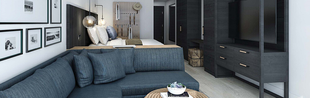 Wave Resort’s rooms were designed by Hirsch Bedner Associates (HBA). Each room is configured to provide views of the Atlantic Ocean from terraces and through floor-to-ceiling, wall-to wall windows. Blackened wood finishes and rope details were integrated throughout, according to Hotel Management Magazine.
