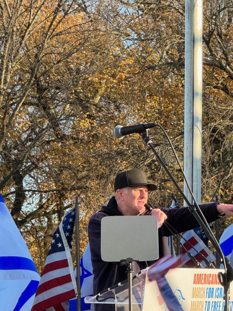 There were disappointingly no speeches from massacre survivors except for Natan Sharansky who suffered 9 years in the Russian gulag during the 70’s for the sole crime of being Jewish. He noted that despite languishing in jail the knowledge of public support aided his survival. We heard from hostage Omer Neutra’s mother, Orna, who described her six foot two son as a dual US-Israeli citizen who loved basketball and chose to serve his country in Gaza before heading to college. “From a place of deep pain, we hold strong for you Omer,” declared his mother as the lugubrious crowd chanted “Bring Them Home.” She implored the spellbound crowd to keep speaking out and show the same warmth her son did to all those he encountered.