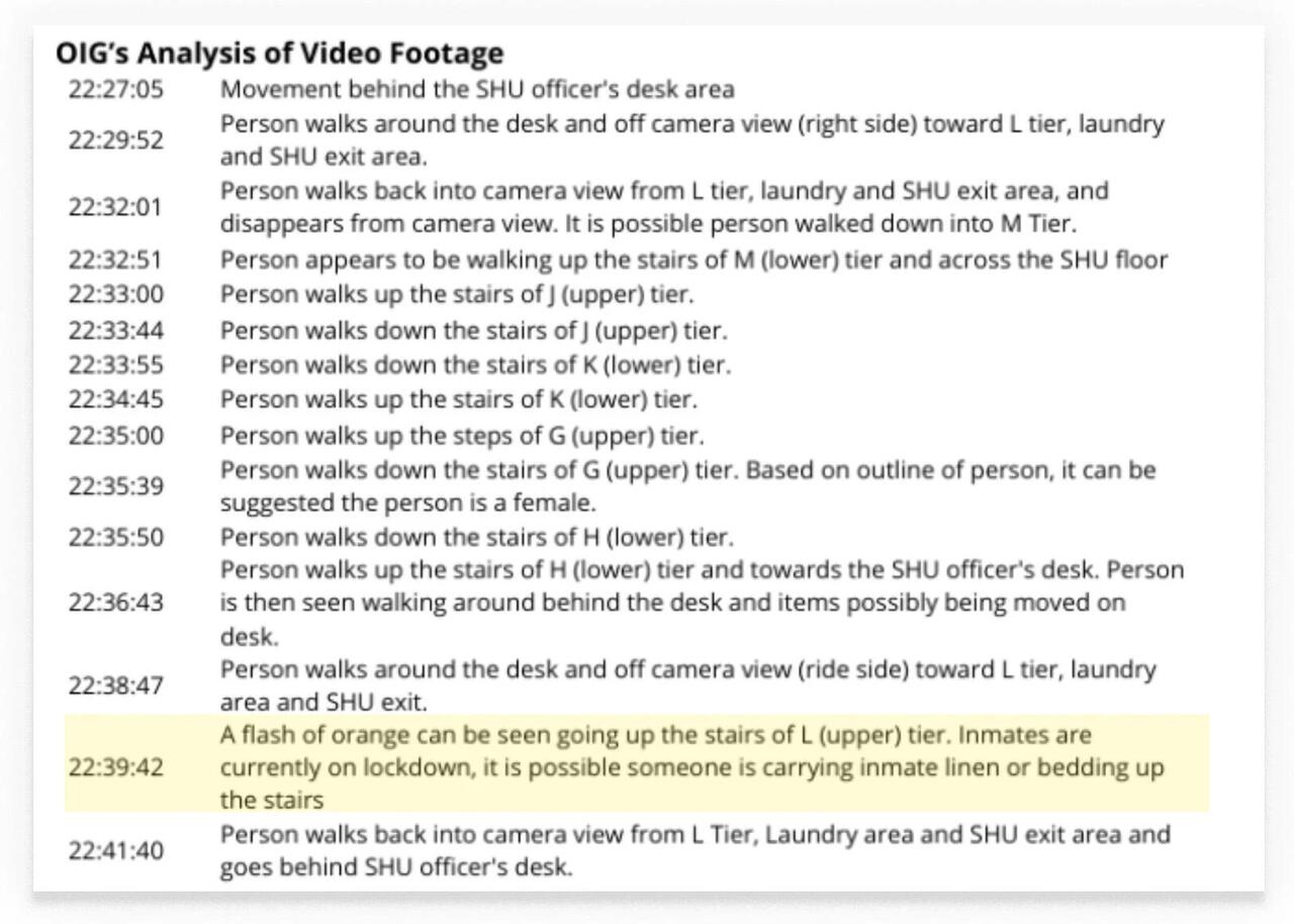 “At approximately 10:39 p.m., an unidentified CO appeared to walk up the L Tier stairway, and then reappeared within view of the camera at 10:41 p.m.,” the inspector general’s log states, according to CBS News.