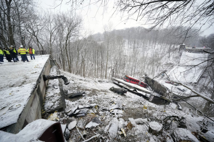 (AP) — Federal investigators on Saturday vowed to put a collapsed bridge in a Pittsburgh park “under a microscope” as they examine evidence, including video from a municipal bus that plummeted along the span, prompting rescuers to rappel down a ravine and form a human chain to reach a few occupants.