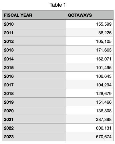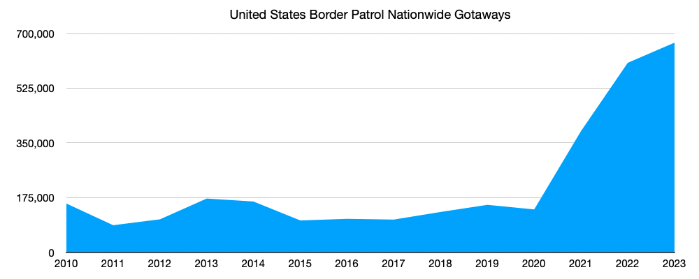 The reports do not mention the huge inflow of “gotaways” who sneak across the poorly guarded border. In 2023, about 670,000 migrants sneaked across Mayorkas’s mostly open border.