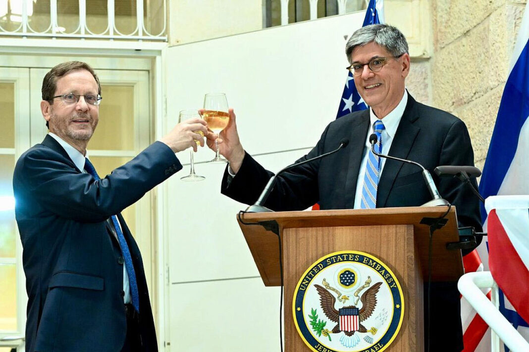 Good evening, distinguished friends and colleagues. It is a pleasure for my wife Ruth and I to welcome our friends President Isaac Herzog and Israel’s first lady, Mrs. Michal Herzog. We are also honored to welcome so many distinguished guests, including Israeli Foreign Minister Yisrael Katz and speaker Amir Ohana. We are delighted to have you join us tonight to mark the 248th anniversary of the United States.