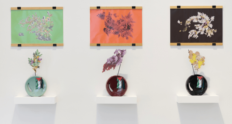 The exhibit, which is composed of three circular vases each adorned with a Palestinian flag and flowers, is currently on display at the Contemporary Jewish Museum in San Francisco.