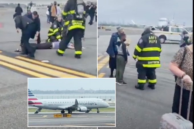 Video posted on social media showed a man spread-eagled face down on the runway asphalt as a pair of emergency personnel knelt beside him. The man did not appear to resist.