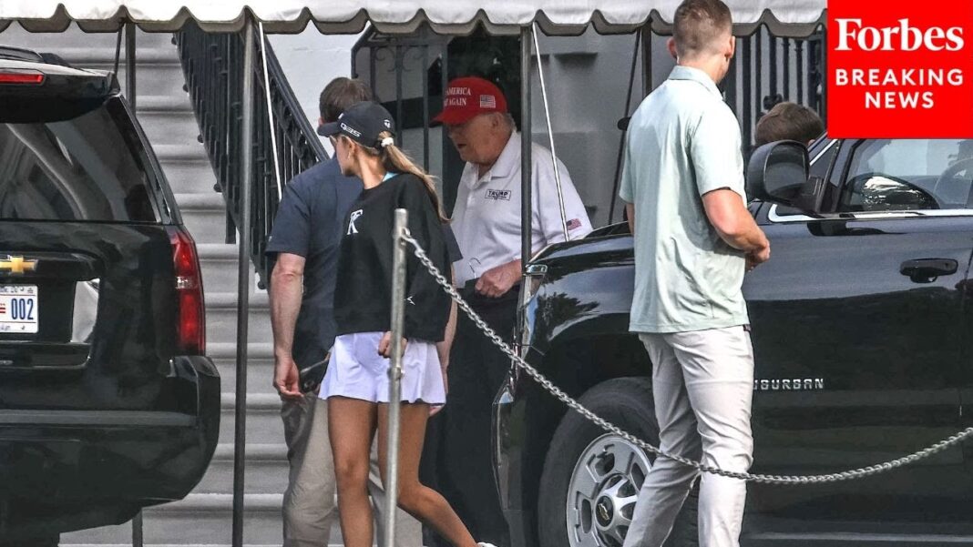 Trump, wearing a white polo, black pants, and a signature red “Make America Great Again” hat, was seen entering a vehicle on the South Lawn shortly before 9 a.m. His motorcade then headed to a golf course in Virginia, according to reporters at the White House.