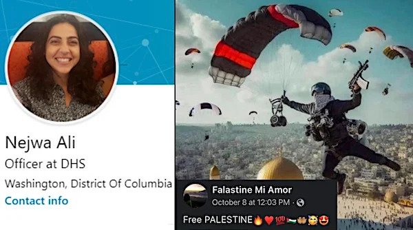 A key member of the federal bureaucracy, those government employees who are supposed to fulfill the ideals of the American dream, is a pro-Hamas extremist who bashes Israel and promotes its destruction – to the point of posting online images of terrorists parachuting in – regularly.