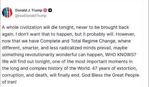 (TJV NEWS) President Donald Trump delivered one of his most ominous warnings yet Tuesday, declaring that “a whole civilization will die tonight” if Iran fails to meet a rapidly approaching U.S. deadline, according to a report from Metro UK.