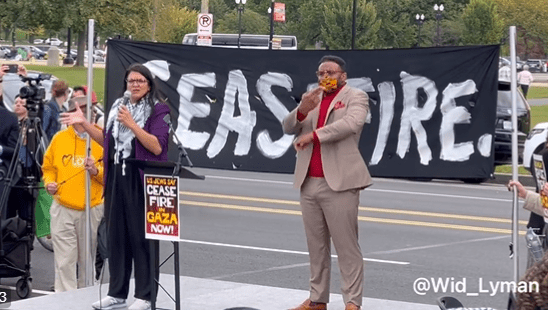 Rep. Rashida Tlaib (D-MI), who falsely accused Israel of bombing a Gaza hospital Tuesday, addressed the protesters.