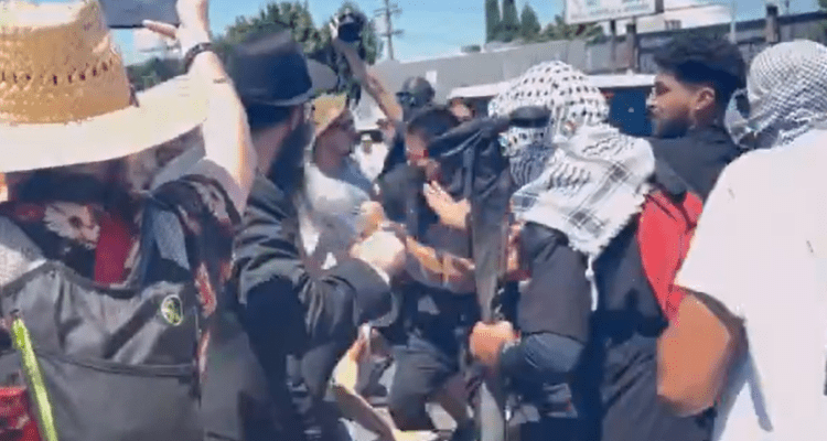 The younger leftist thugs wore ski goggles and masks, carried skateboards and metal water bottles, ‘legal’ weapons typically seen during Antifa clashes, and some were likely among those who had previously terrorized Jewish students at the UCLA terror encampment. And it did not take much time before they were assaulting Jewish community members in the neighborhood.