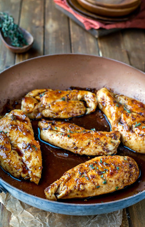 Serve chicken warm with sauce. Garnish with chopped parsley or chives.
