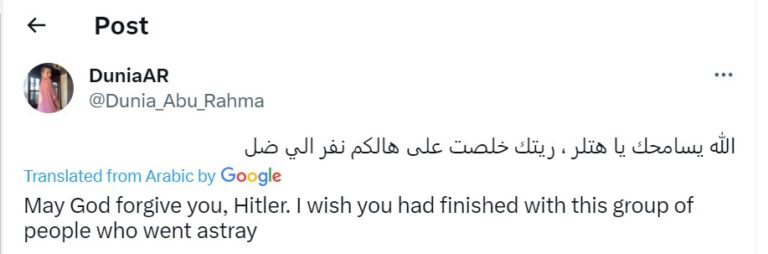 In one tweet, Abu Rahma posts “May God forgive you, Hitler. I wish you had finished with this group of people who went astray.”…