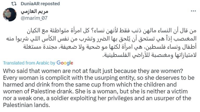 Throughout Hamas’ October 7 slaughter, Dunia Abu Rahma both tweeted and reposted several tweets supporting the massacres.