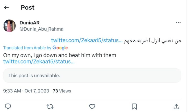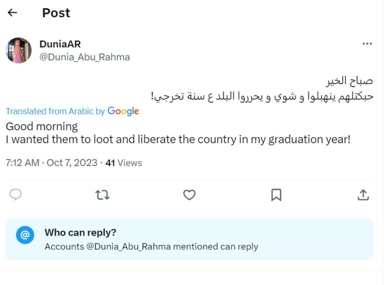 On October 7, Dunia Abu Rahma also reposted several tweets by other accounts celebrating the carnage.