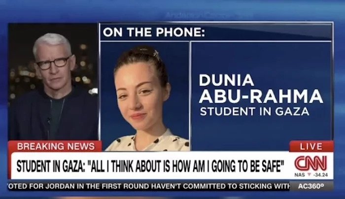 …Dunia Abu Rahma, a 22-year-old architecture student from Gaza, has appeared in recent days on both CNN’s Anderson Cooper 360 and NBC News to tell her story.