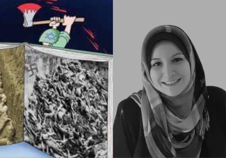 In 2017, Hussaini posted a cartoon on Twitter that showed a soldier with a Jewish star on his helmet hiding behind a photo of Holocaust victims while slaughtering a group of Arabs with an ax. The cartoon, drawn by Derkaoui Abdellah, was submitted as part of Iran’s state-sponsored 2006 Holocaust cartoon contest and displayed on the competition’s website. Abdellah won first place in the contest for another drawing.