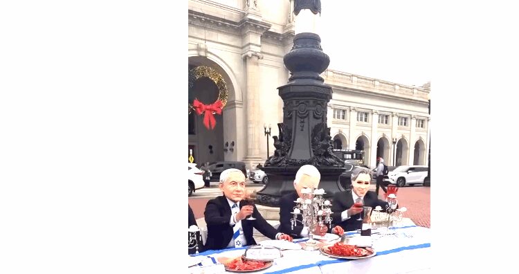 A graphic live installation of actors dressed up as President Trump, Israeli Prime Minister Benjamin Netanyahu and other officials eating dead Gazans at a banquet was set up in front of Washington DC’s Union Station on Thursday.