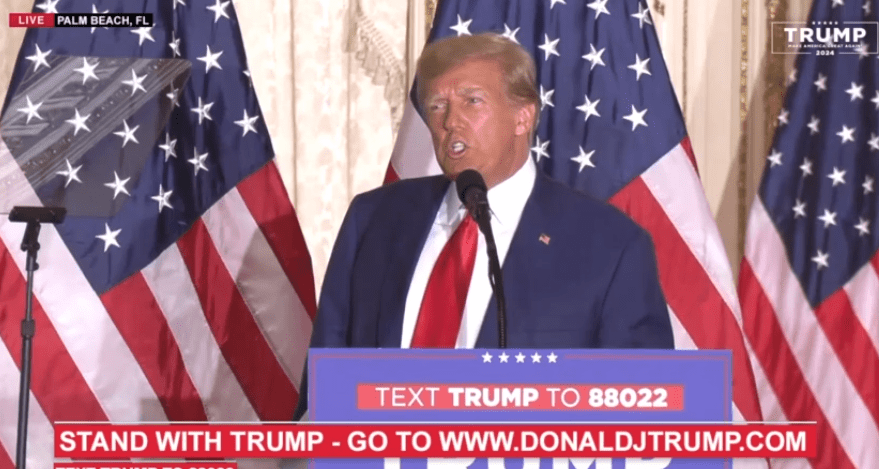 “From the beginning, the Democrats spied on my campaign,” the former president said. “They attacked me with an onslaught of fraudulent investigations. Russia, Russia, Russia, Ukraine, Ukraine, Ukraine, Impeachment hoax number one, impeachment hoax number two, the illegal and unconstitutional raid on Mar-a-Lago right here.”