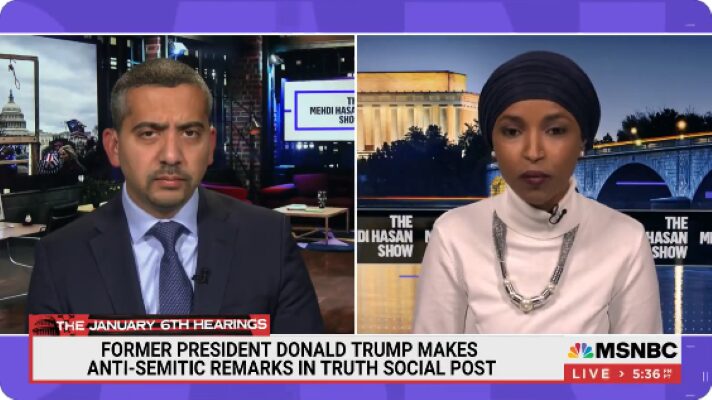 MSNBC’s Medhi Hasan was blasted for turning to U.S. congresswoman Ilhan Omar as a commentator on Jew-hatred when she herself has promoted antisemitic conspiracy theories, pushed the dual loyalty canard, and incited animosity towards Jews in the U.S. and Israel.