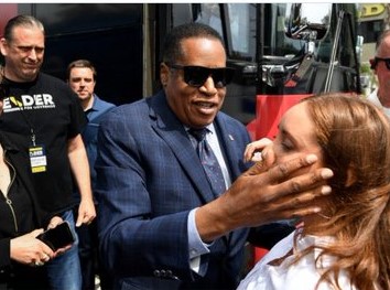 “Yesterday @larryelder was my guest,” she tweeted. “We were attacked by a group yelling racial slurs, a white woman in a gorilla mask threw eggs. Yet @latimes finds a deceiving pic of us about to hug to confuse the story- a HATE CRIME was committed against a black man running for Governor of CA.”