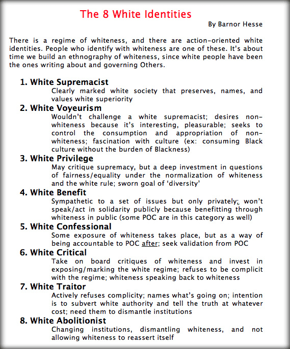 The two final stages, “white traitor” and “white abolitionist,” demands that white people “subvert white authority,” “dismantle institutions,” dismantle whiteness and not allow whiteness to reassert itself.