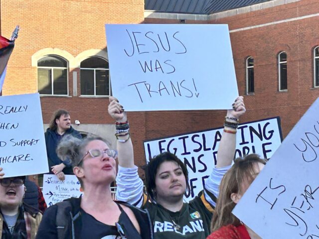 Pro-trans protesters disrupt rally against child sex changes. (screenshot, Spencer Lindquist/Breitbart News)