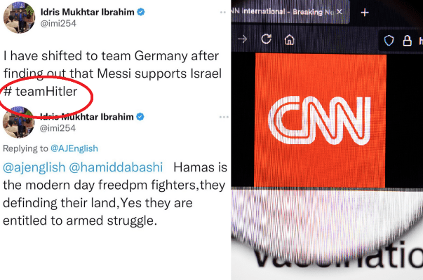 According to tweets collected by HonestReporting, Ibrahim posted the hashtag “Team Hitler” in a post about a soccer match between Israel and Germany.
