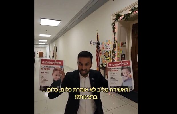 Yosef Haddad, an Arab Israeli Zionist activist, posted a video of his putting up photos of hostages in front of the office of Progressive Palestinian-American Congresswoman Rashida Tlaib and hanging an Israeli flag over her Palestinian one.