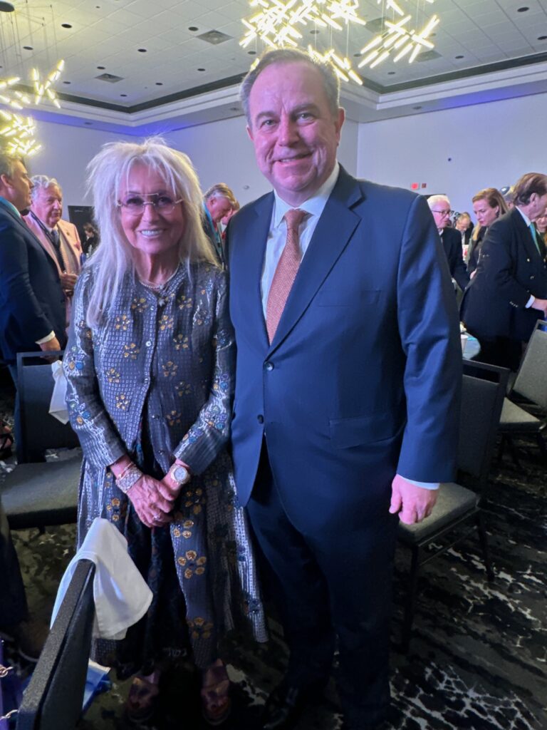 Falic presented the aptly titled “Zionist Hero Award” to media giant and Newsmax CEO Chris Ruddy. Ruddy dedicated his award to his late Christian mother who loved the Jewish state. Ruddy’s own fascination with Israel began when he attended Hebrew University at age 19. Praising Israel as a great democracy and the last hope in the Middle East, Ruddy expressed incredulity at the notion of Jews being afraid to walk the streets of New York-a large part of which he attributed to the media. Comparing Netanyahu to Roosevelt, Ruddy extolled Netanyahu for his impeccable leadership as he seeks to destroy Hamas monsters. He called Putin’s quest to overtake the free world “pure evil” remarking that Putin’s birthday of October 7th was hardly a coincidence as Ruddy believes Putin’s fingerprints were all over the complex attack. Ruddy said the Ukraine and Israeli wars were due to a lack of leadership which a Trump presidency would remediate. Ruddy received a standing ovation as he concluded with the promise that Newsmax would be at the forefront of defending Israel.