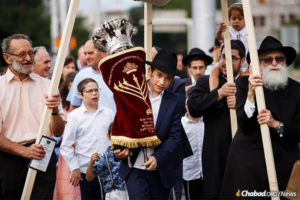 As part of the joyous dual event, the boy of honor, Tzali Myers, helped lead the customary Torah-scroll procession through the capital city of Bratislava, past the Presidential Palace and busy urban surroundings, to a well-appointed new Chabad center that his parents established in late 2017.