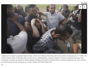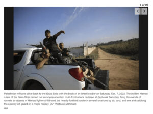 The lead picture of the Saban article was shot by Eslaiah who photographed the terrorists departing Kfar Azza after conducting one of the most brutal slaughters in history. The Committee for Accuracy in Middle East Reporting (CAMERA) warned the AP in 2018 that Hassan was a rabid anti-Semite who “praises terrorists and expresses joy over the murder of innocent and unarmed Israelis.” To no avail, as they utilized Eslaiah as a source for a 2018 story claiming that Israel was responsible for the death of a 4-year-old in a Gaza border clash.