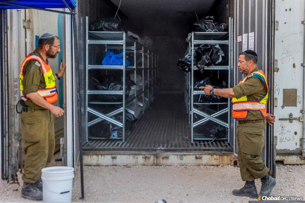 “Truck after truck of bodies. Floor to ceiling, bodies. Each one a human, a loved one, a life,” says Noiman, who normally serves as a Chabad emissary to Maccabim-Re’ut. “The most jarring thing was the sheer number. I felt like I was reliving a scene from the Holocaust—piles of dead Jews everywhere.”