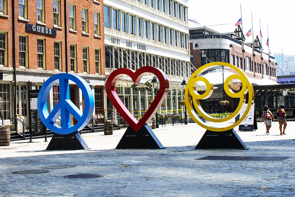 Scott Gerber created the colorful installation Peace, Love & Happiness, which comprises a trio of sculptural symbols, to foster healing through art. “Peace Sign” encourages passersby to be calm amid all that is going on in the world. With “Heart,” his intent is for people to remember to be kind to one another. Finally, “Smiley Face” is meant to evoke happiness.