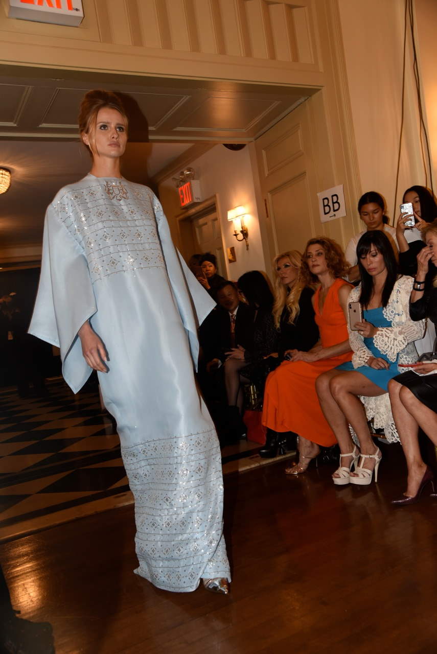 My favorite of the night was the pastel metallic lilac gown accompanied by a rose encrusted miniskirt with matching sleeves-the sexy vibe accompanied by girlish playfulness is what fashion is all about.  Concluding with a dramatic lilac column gown with a train and a blue caftan high neck gazar dress brought me back down to earth-that is until Carol Alt sashayed down the runway in a princess wedding gown with silver hand-beading.  This was Toi telling the world that while we embrace the excitement of the new we must also pay homage to classic beauty that has paved the way for the magic of the modern era.