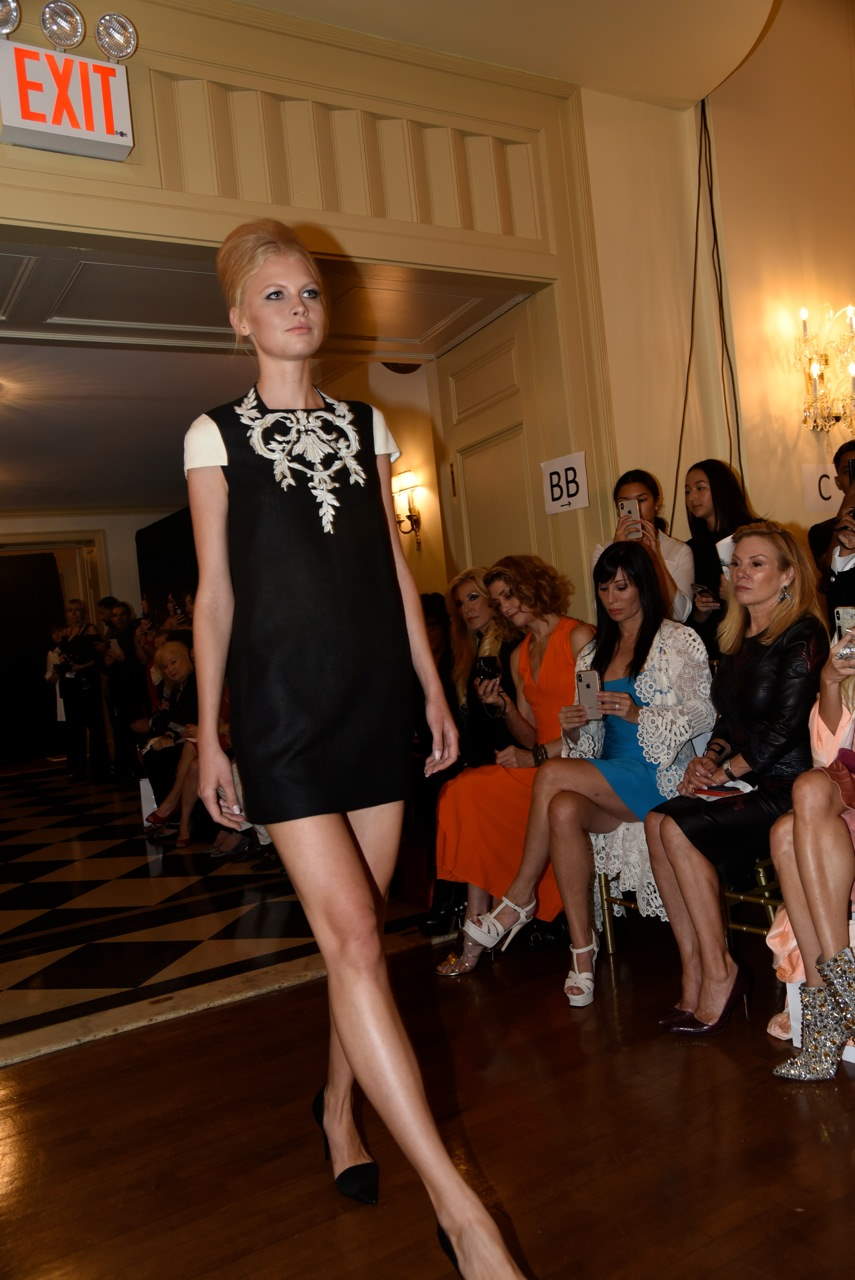 Toi did not disappoint, regaling the crowd with his signature touches of flowing capes, diamond brooches, floral detailing, and exquisite designs ratcheted up a few notches for his anniversary.  The 8 PM show, which started forty minutes late, began with the National Anthem and was soon followed by the most competently executed show of Zang’s I have witnessed.  The models were perfection with their hair styled in a high chignon reminiscent of Brigitte Bardot with some Audrey Hepburn and Twiggy thrown in.  After sitting through a lengthy fashion week the most noteworthy trait of a Toi show is the attention he pays to each and every detail ranging from the harmonious classical music, to the perfect fit of each dress that glides down the runway.  Unlike other shows where earplugs are a necessary staple and vulgar designs are ubiquitous Zang’s collections transport the audience to a different time and era.