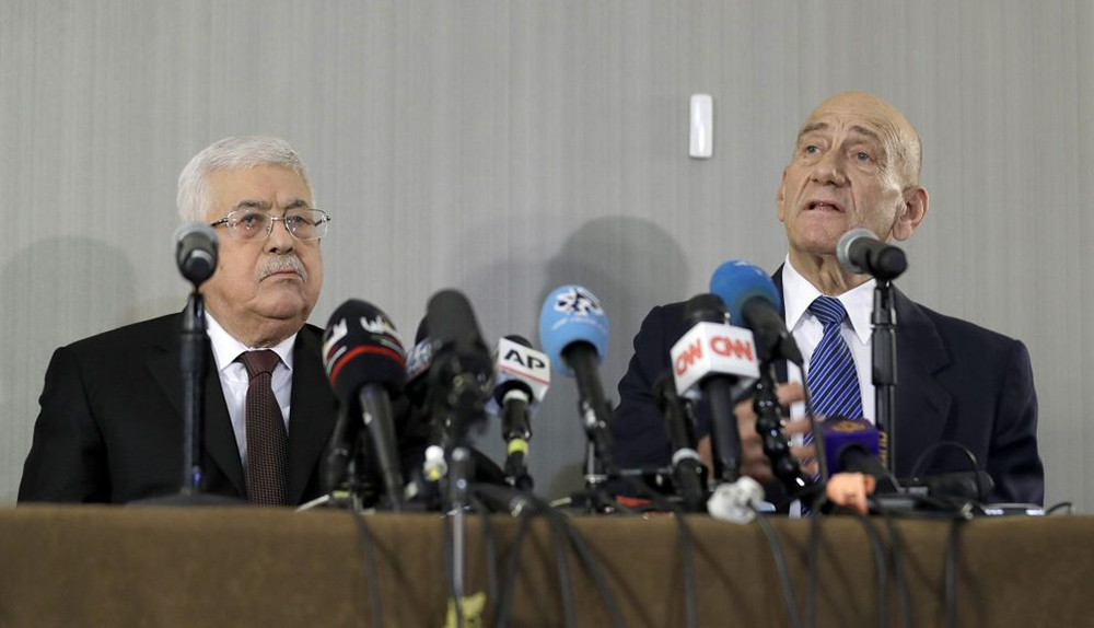 The day after AIPAC’s humiliation, PLO chief Mahmoud Abbas gave a joint press conference at the United Nations in New York with Israel’s disgraced former prime minister Ehud Olmert. Like congressional Democrats, the two men rejected Trump’s peace plan. As they ended their remarks, Abbas hugged and kissed J Street chairman Jeremy Ben-Ami.