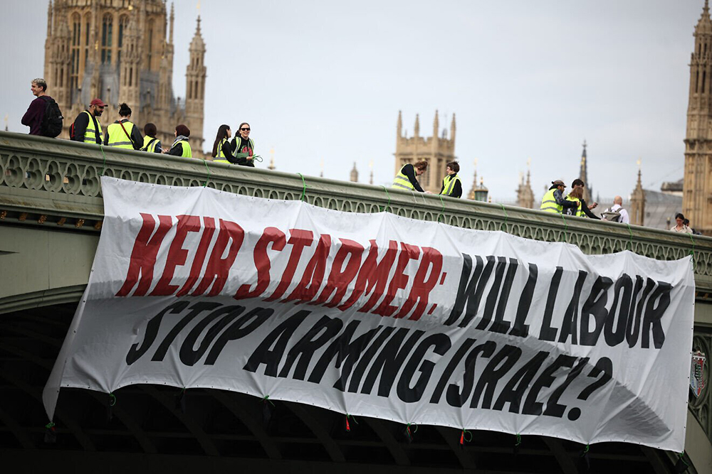 A banner reading “Keir Starmer: Will Labour Stop Arming Israel?” is hung over the side of Westminster Bridge in front of the Palace of Westminster, home to the Houses of Parliament, during early morning rush hour in London on June 3, 2024. Photo by Henry Nicholls/AFP via Getty Images.