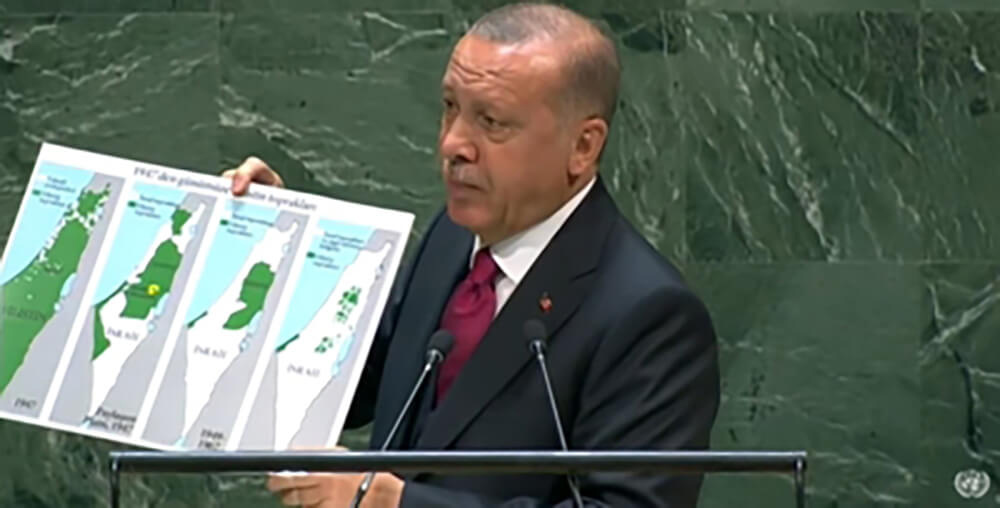 Turkish President Recep Tayyip Erdogan used his United Nations General Assembly speech last week to blast Israel as the cause of “injustice” in the Middle East and vow that his country “will continue to stand by the oppressed people of Palestine as she has always done.” But a new report by Israel’s Meir Amit Intelligence and Information Center, as well as new sanctions announced by the U.S. Treasury Department, make it clear that Erdogan is in no position to cast aspersions.