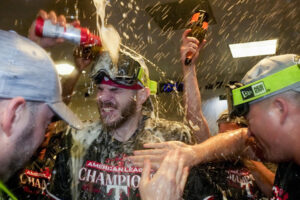 The Texas Rangers celebrate in the locker room with bottles of bubbly after clinching the ALCS title in Game 7. They will now be moving on to the World Series. Photo Caption: AP/Godofredo A. Vasquez