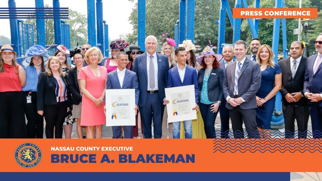 On hand Wednesday to pay tribute to two Nassau County residents who were the winning jockeys at the 2023 Kentucky Derby and the Preakness Stakes was Nassau County Executive Bruce A. Blakeman. The professional jockeys, Javier Castellano, who was riding “Mage” won the 2023 Kentucky Derby, and John Velazquez, who was riding “National Treasure” won the 2023 Preakness Stakes. This was John Velazquez’ first victory at the Preakness Stakes.