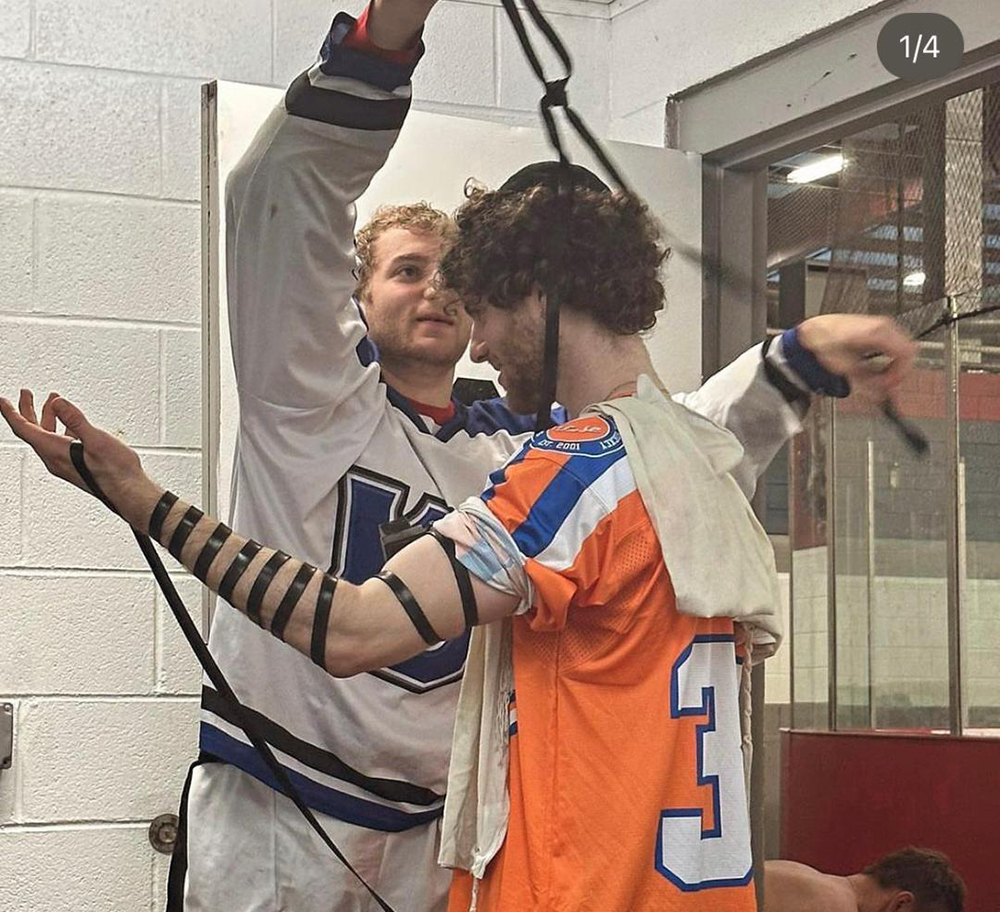 The buzzer ended Yeshiva University Roller Hockey’s 12-5 victory over Syracuse University. As the teams shook hands and left the rink, star forward Sol Feder noticed the name “Cohen” on the back of an Orange Jersey. He asked, “Are you Jewish?” Daniel Cohen followed Feder to the Maccabees’ locker room to fulfill a lifelong dream. Cohen didn’t have an official bar mitzvah and never put on tefillin. With Feder’s guidance, the 21-year-old spiritually became a man on Sunday. The talet was draped around his jersey, tefillin shel Yad was wrapped around his left arm, and the shel Rosh was on his head, as well as a kippah from Ariel Greenberg.