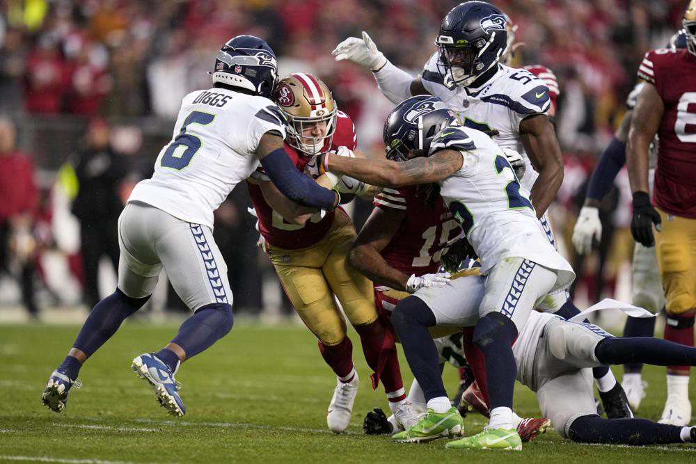 The feisty Seahawks put a scare into their division rivals by taking a 17-16 lead into the break, but a 25-0 second half rampage behind “MR Irrelevant” himself for being the last pick in this years draft in Brock Purdy saw the NFC West champs advance to the divisional round, and clinched the “Super Sweep” against their nemeses(two wins in the regular season, and eliminated them from the postseason). After an early Robbie Gould field goal for a 3-0 lead, a Christian McCafrey 67 yard run set up his score to push the advantage to double digits. Smith would take over from there and find Kenneth Walker in the end zone, before he later hit DK Metcalf down the left sideline for a 50 yard touchdown to put the Seahawks ahead 14-13. The teams would exchange field goals which saw Seattle take the lead into the halftime locker room.