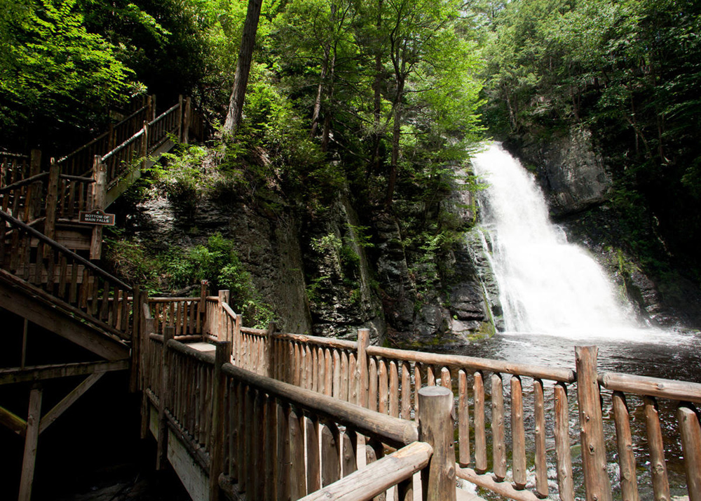 Located just outside Delaware Water Gap National Recreation Area, visitors pay a fee to gain access to the park, which first opened in 1904 and is home to exhibits and fun activities for kids and families as well as two miles of sprawling hiking trails. A fifteen-minute walk along the picturesque Green Trail (involving some steps) leads to the 100-foot drop of the Main Falls. For a longer adventure and to see more of the falls, plan a trek along the Yellow, Blue or Red Trails.