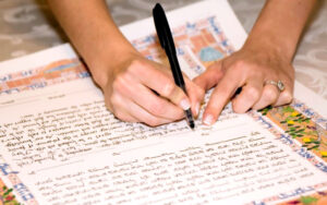 Today, a standard ketubah is a printed form with blank spaces for the date, location, sums of money, names of the bride and groom, and the witnesses’ signatures. Before the wedding ceremony, the officiating rabbi fills in these blanks and supervises the signing of the document by the witnesses. The ketubah must be filled out by a rabbi well-versed in Jewish law, especially since the document’s nuances can vary greatly depending on the particulars of the couple in question (e.g. if the woman is a widow, convert, or divorcee).