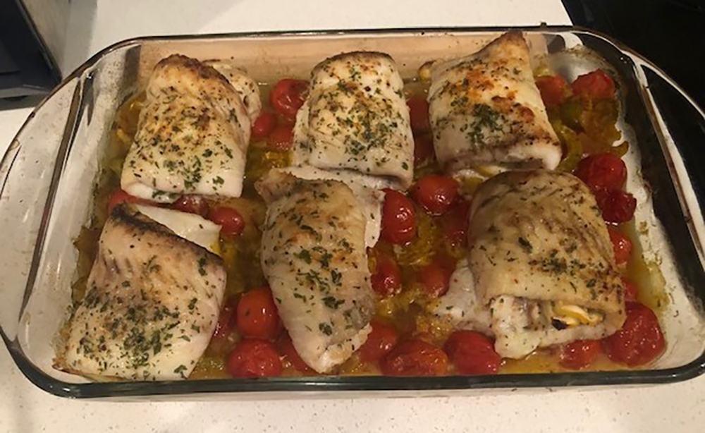 Cut flounder fillets in half lengthwise. Lightly sprinkle each half with za’atar, salt and pepper. Top with a lemon wedge. Roll up beginning at the thin end. Place on top of the tomato mixture. Brush with olive oil and sprinkle with parsley.
